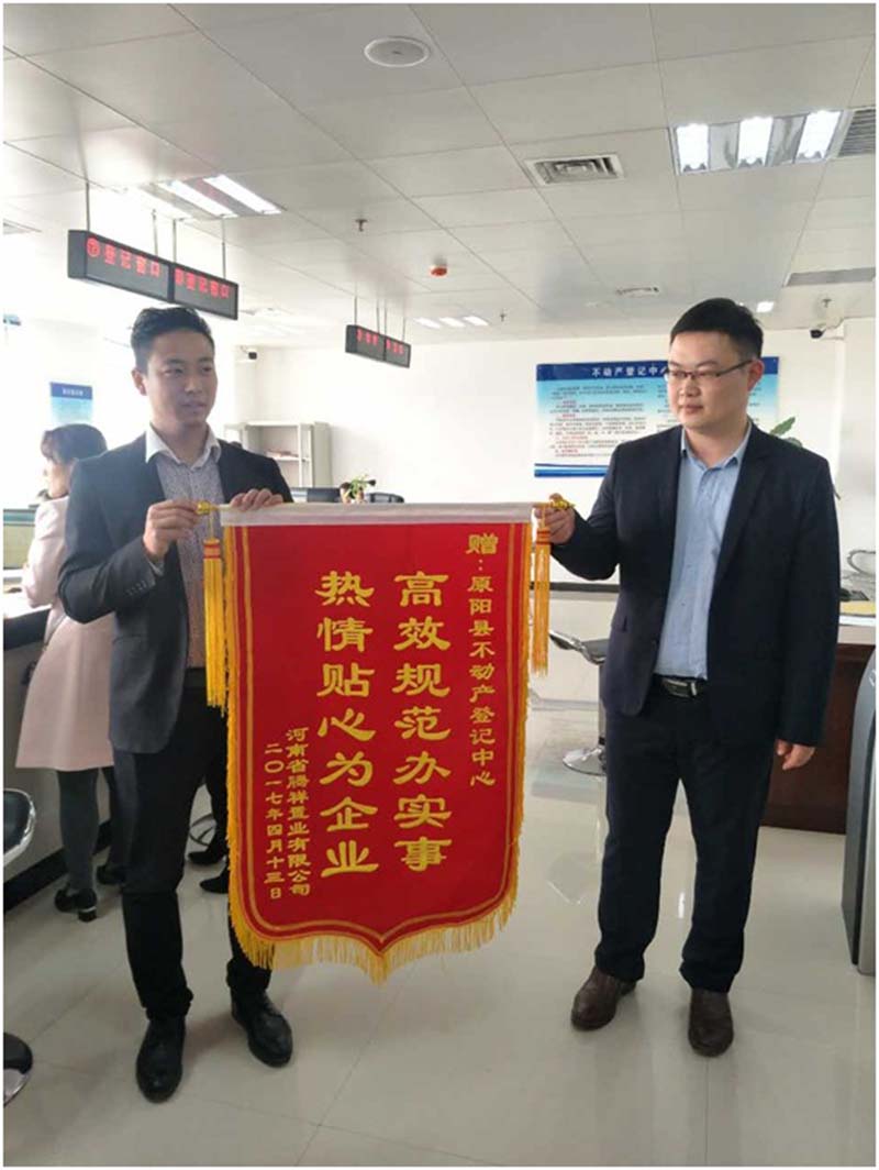 4月14日上午,河南省腾祥置业有限公司员工向县不动产登记中心赠送一面“高效规范办实事,热情贴心为企业”的锦旗。以感谢不动产登记中心工作人员延迟下班及利用节假日休息时间为该公司客户办理不动产登记手续的工作态度。词语不多却体现了企业对中心服务工作的肯定与认可,也是我们进一步提高服务理念,做好不动产登记工作的动力。