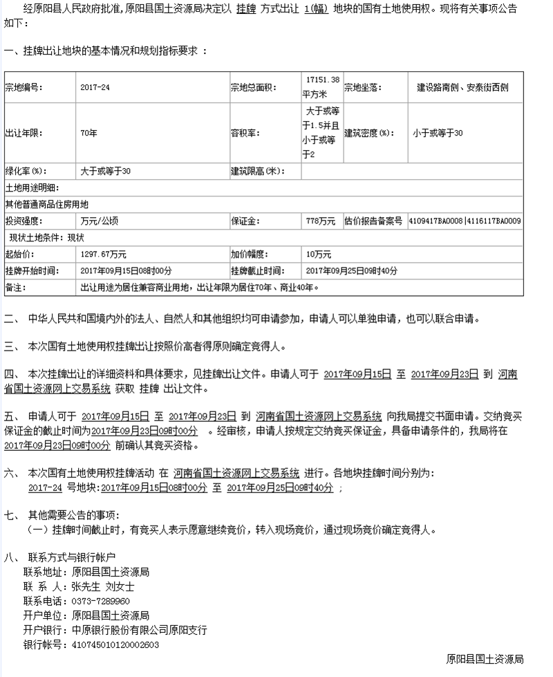 国有土地使用权挂牌出让公告(原国土网(挂)告字[2017]9号)