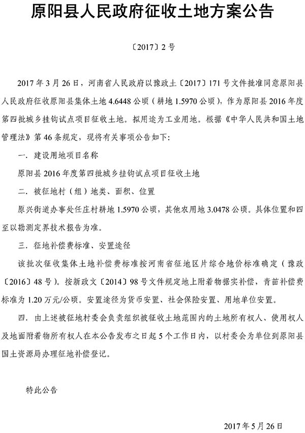 原阳县2016年度第四批城乡增减挂钩试点项目征收土地方案公告